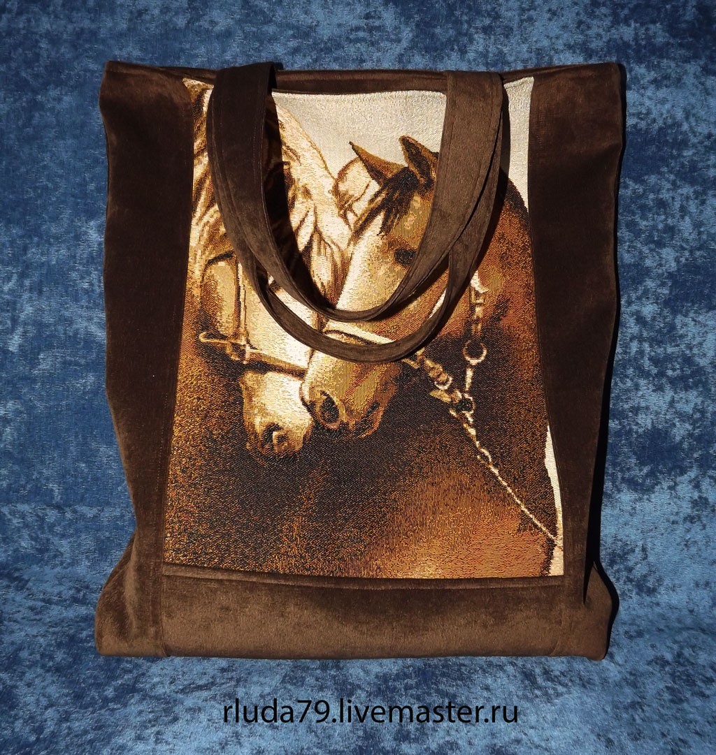 Сумка выполнена из гобелена. Задняя сторона из ткани Микровельвет. Внутри подклад с двумя кармашками, один на молнии. Сзади тоже есть карман. Сумка объемная и вместительная, закрывается на молнию. Носится на плече.