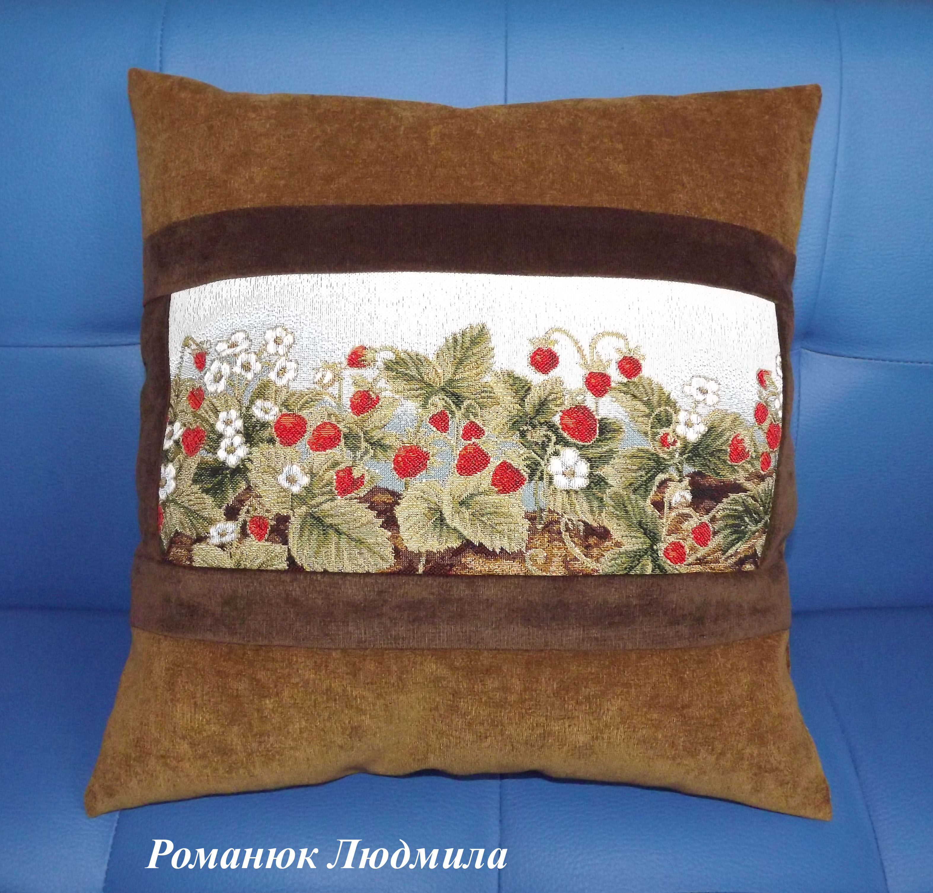 Выполнена из мебельной ткани и гобелена. Закрывается на молнию.