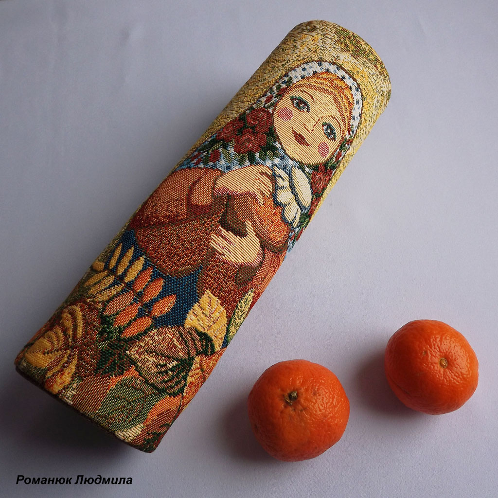Сшита из гобелена. Внутри подклад, закрывается на молнию. Дно и верх укреплен пластмассовой вставкой. Держит форму, может стоять вертикально. Станет прекрасным украшением на вашей кухне.