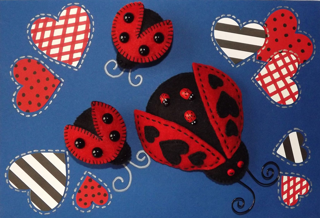 Большая божья коровка - игольница на магните для холодильника, маленькие - заколки на крокодильчиках. Основание - коробка конфет, обклеена разноцветной бумагой и декорирована разными сердечками для красоты.