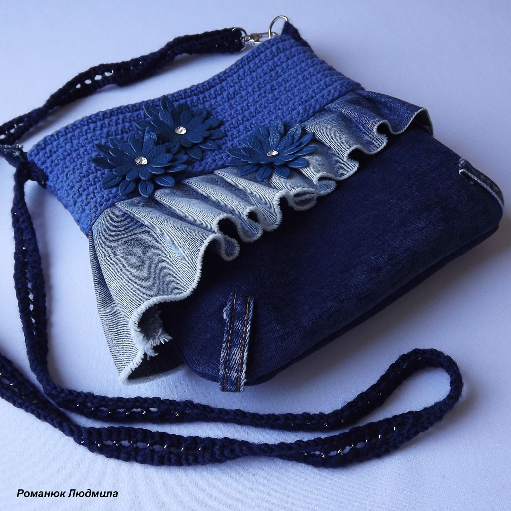 Ширина сумочки 21 см, глубина 22 см. Ручка сделана из металлической цепочки, обвязаной пряжей. Максимальная длина ручки 115 см.