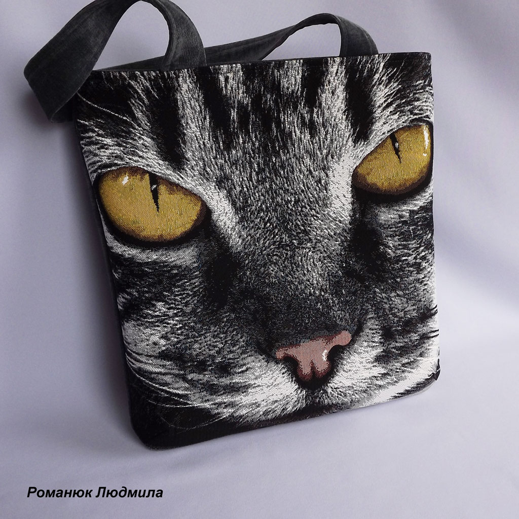 Сумка выполнена из гобелена и ткани микровельвет. Рисунок кота на гобелене очень красивый, яркий, притягивает к себе внимание.
