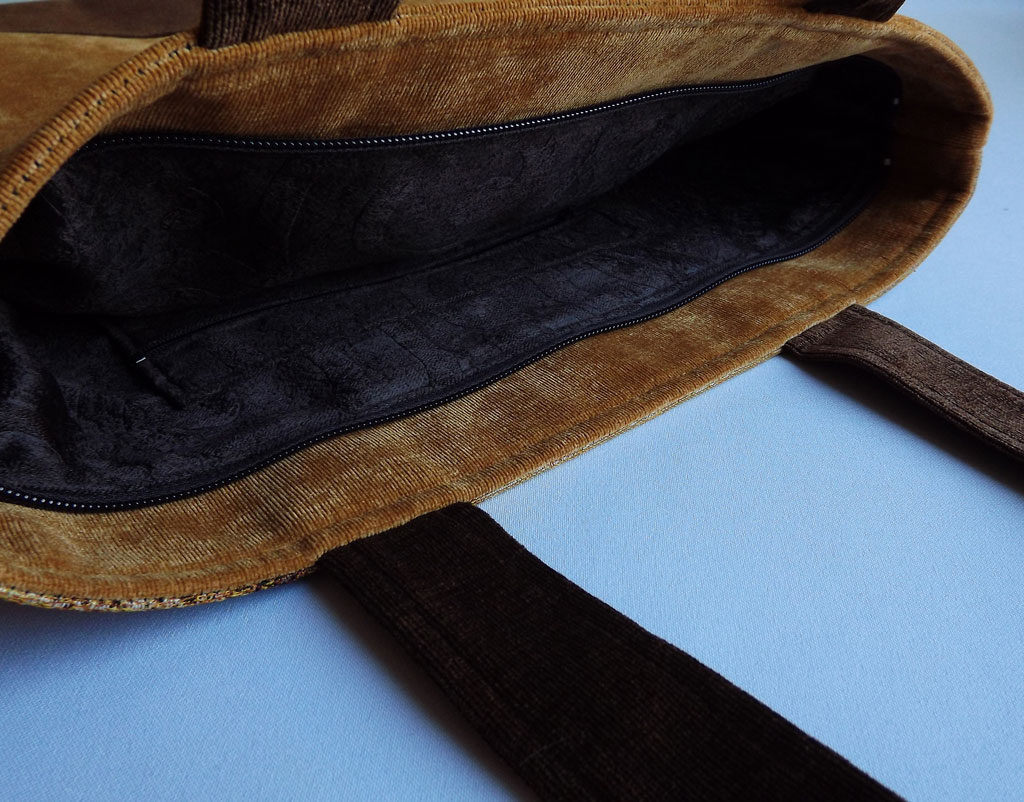 Внутри сумочки есть подклад темно-коричневого цвета, приятный на ощупь, с двумя карманами, один на молнии. На обратной стороне сумки есть врезной кармашек на молнии. Сумка большая и вместительная, закрывается на молнию, носится на плече.