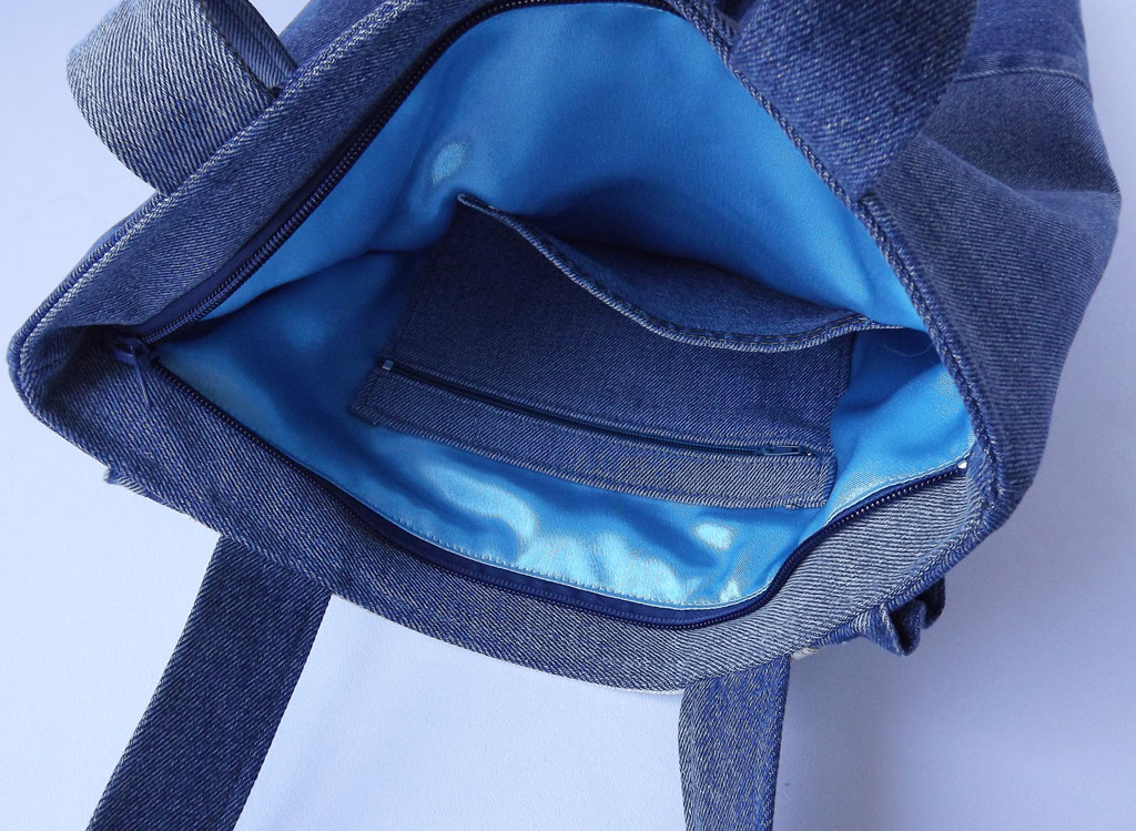 Внутри сумки подклад из атласной ткани с двумя джинсовыми карманами, один из них на молнии.