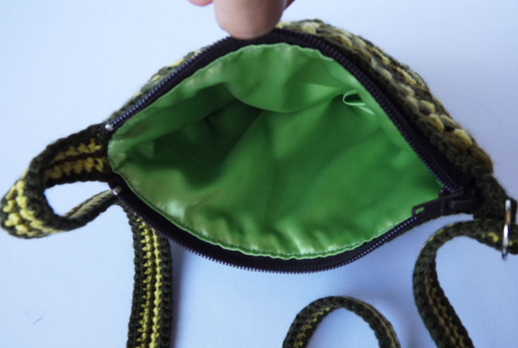 Внутри есть подклад. Сумочка закрывается на молнию. Длину ручки можно отрегулировать по вашим размерам.