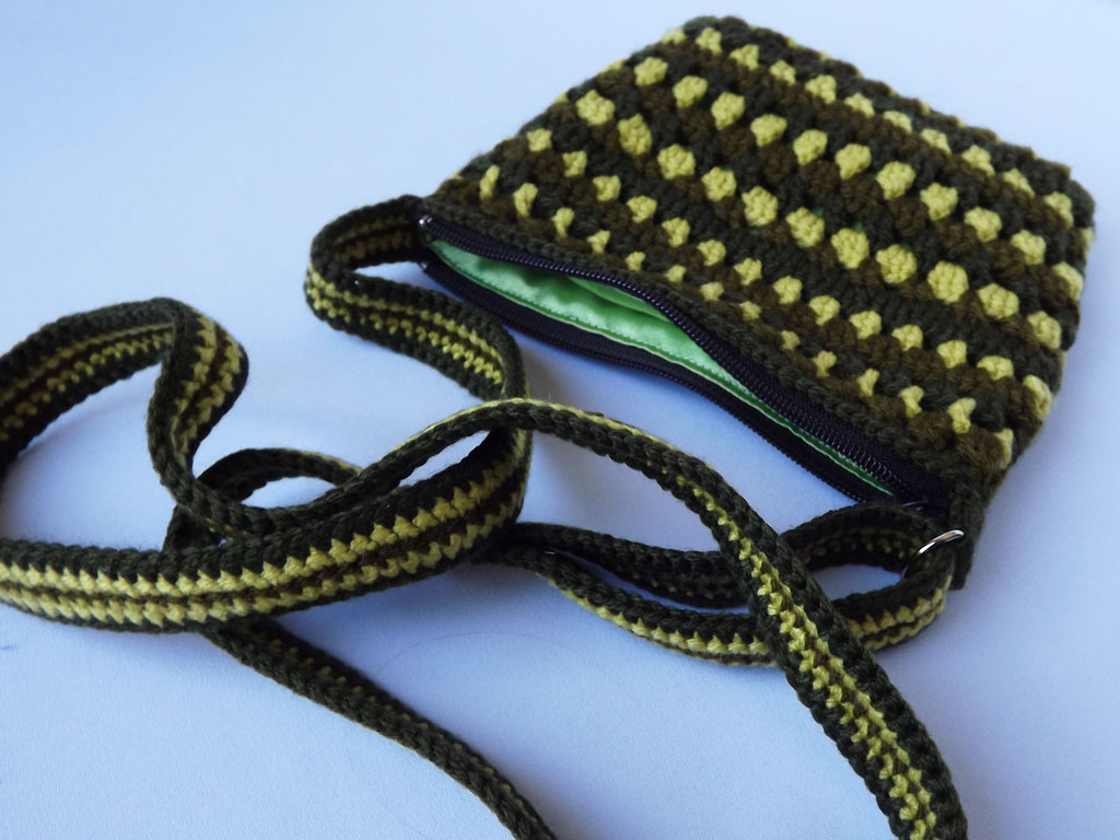Внутри есть подклад. Сумочка закрывается на молнию. Длину ручки можно отрегулировать по вашим размерам.
