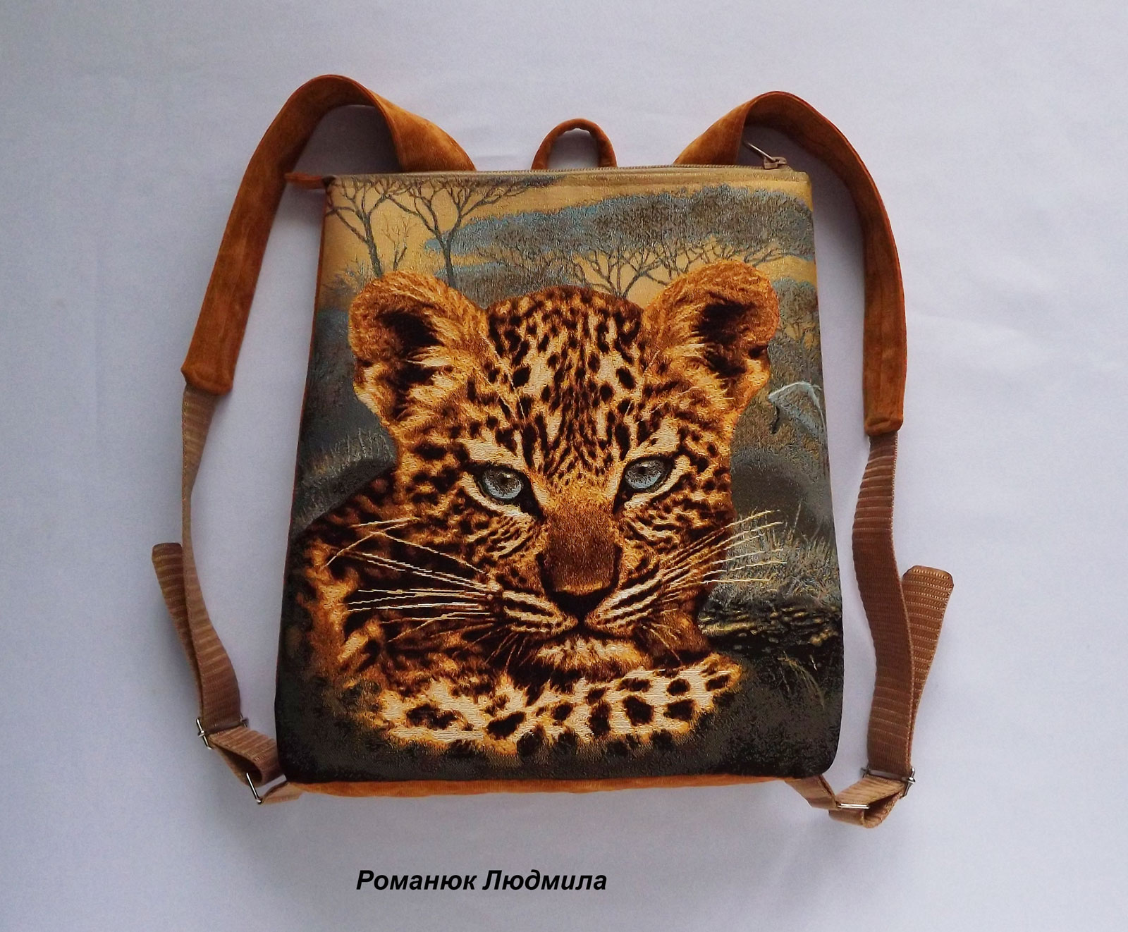 Рюкзак выполнен из гобелена с рисунком, обратная сторона выполнена из микровельвета. Дно рюкзака простегано и уплотнено. Внутри подклад с тремя кармашками, один на молнии. Сзади есть удобный карман на молнии. Ручки на рюкзаке можно регулировать по длине.