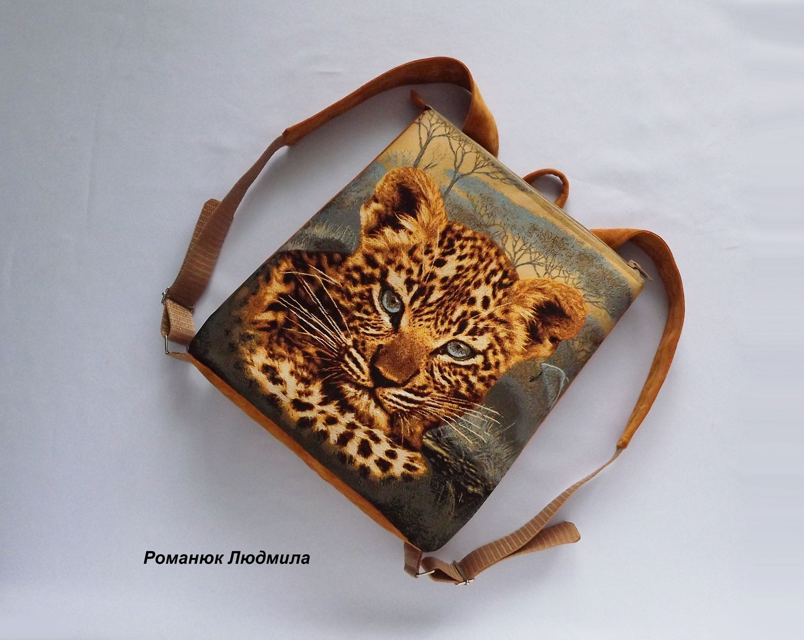 Рюкзак выполнен из гобелена с рисунком, обратная сторона выполнена из микровельвета. Дно рюкзака простегано и уплотнено. Внутри подклад с тремя кармашками, один на молнии. Сзади есть удобный карман на молнии. Ручки на рюкзаке можно регулировать по длине.