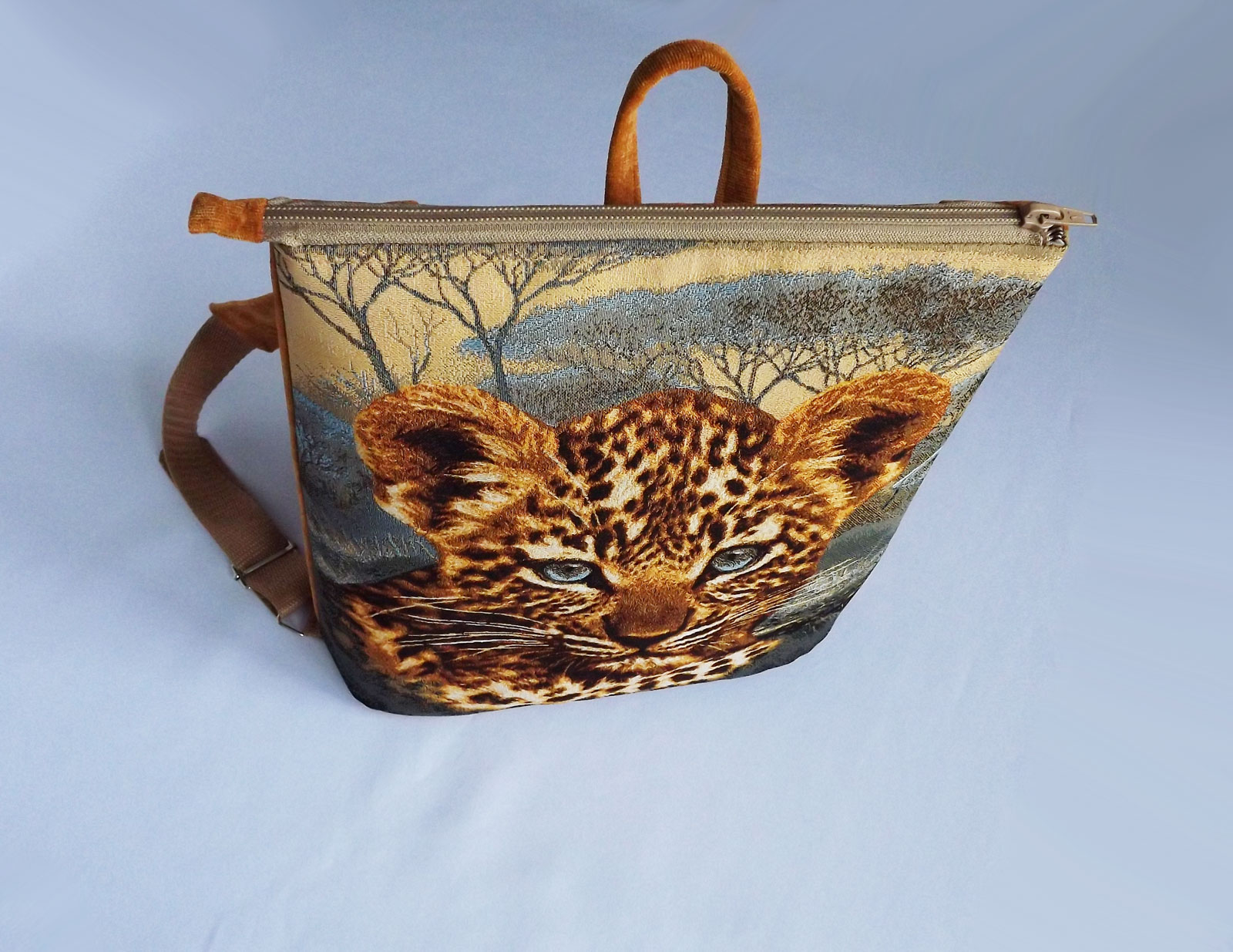 Рюкзак выполнен из гобелена с рисунком, обратная сторона выполнена из микровельвета. Дно рюкзака простегано и уплотнено. Внутри подклад с тремя кармашками, один на молнии. Сзади есть удобный карман на молнии. Ручки на рюкзаке можно регулировать по длине.
