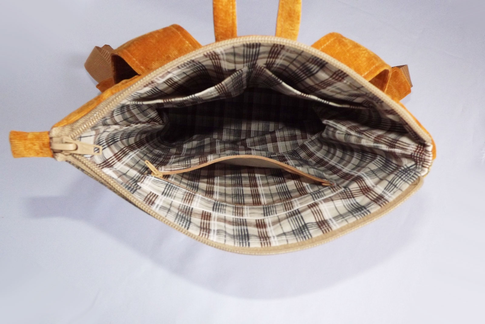 Рюкзак выполнен из гобелена с рисунком, обратная сторона выполнена из микровельвета. Дно рюкзака простегано и уплотнено. Внутри подклад с тремя кармашками, один на молнии. Сзади есть удобный карман на молнии. Ручки на рюкзаке можно регулировать по длине.