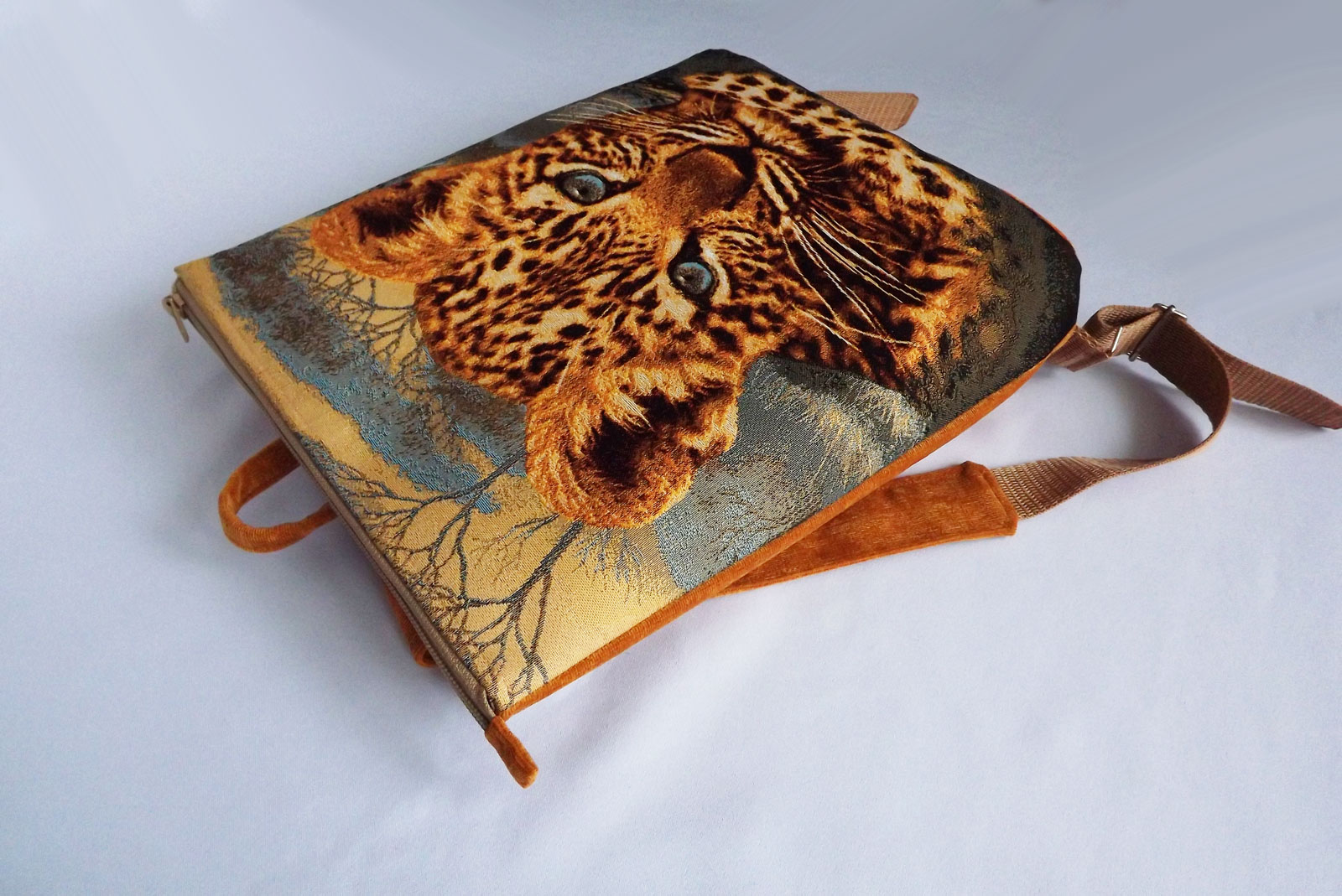Рюкзак выполнен из гобелена с рисунком, обратная сторона выполнена из микровельвета. Дно рюкзака простегано и уплотнено. Внутри подклад с тремя кармашками, один на молнии. Сзади есть удобный карман на молнии. Ручки на рюкзаке можно регулировать по длине.