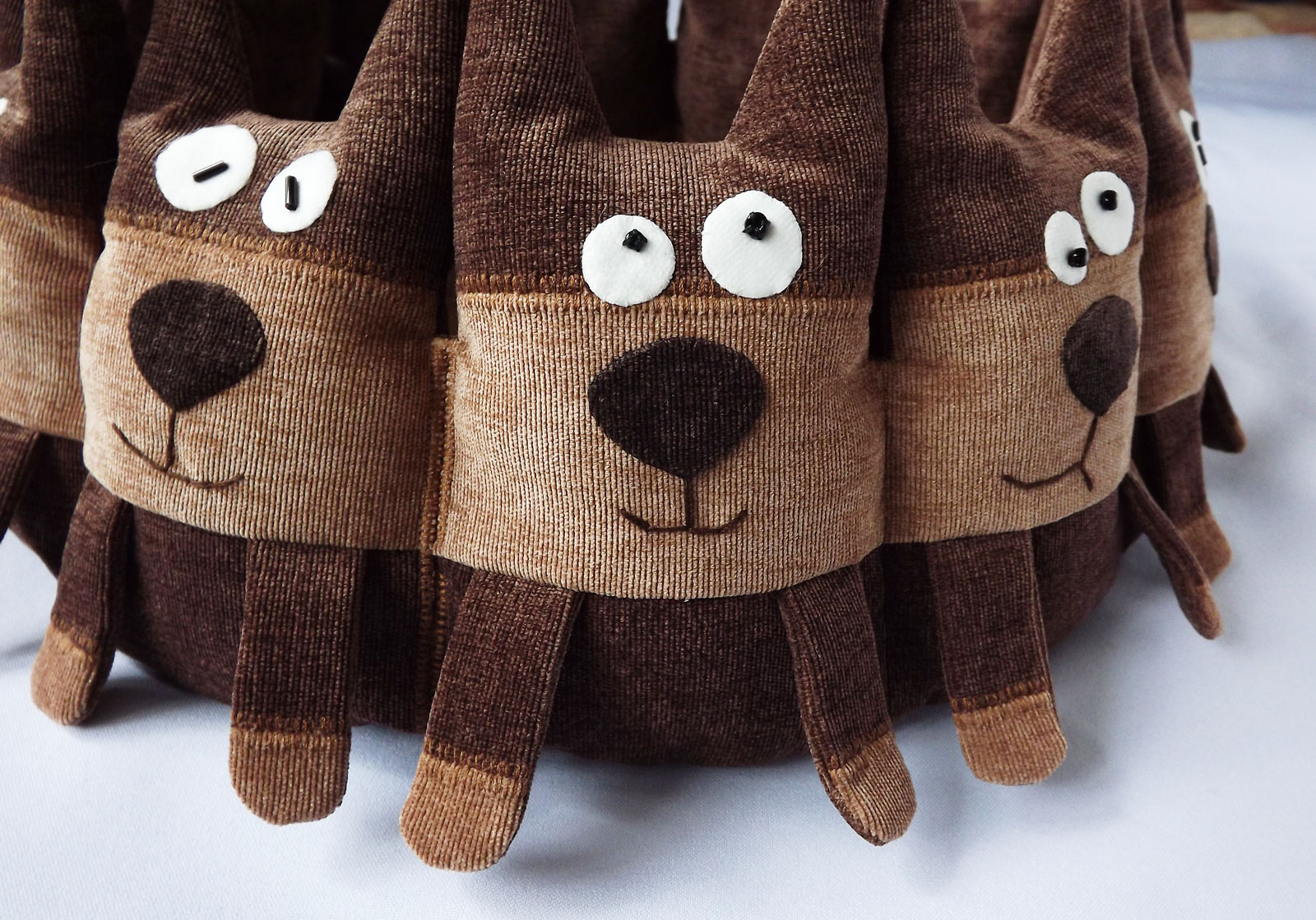 У котиков все глазки, носики и ротики пришиты в ручную, никакого клея, поэтому вы можете спокойно чистить лежанку пылесосом или стирать в стиральной машине.
