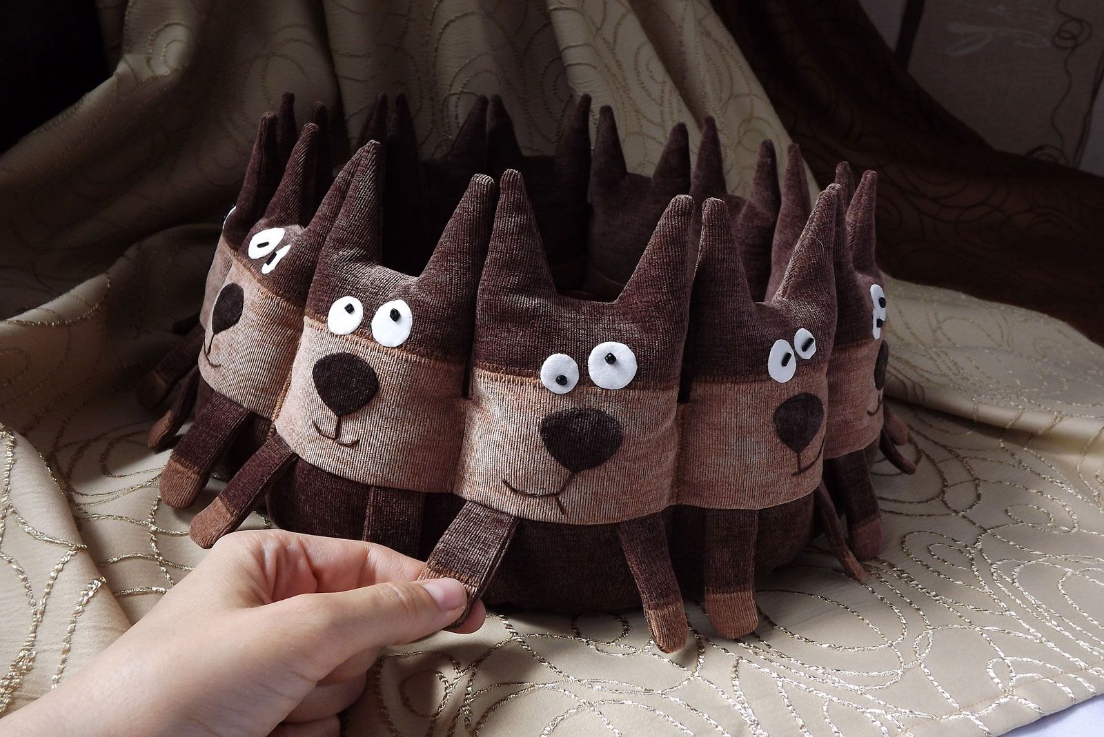 У котиков все глазки, носики и ротики пришиты в ручную, никакого клея, поэтому вы можете спокойно чистить лежанку пылесосом или стирать в стиральной машине.