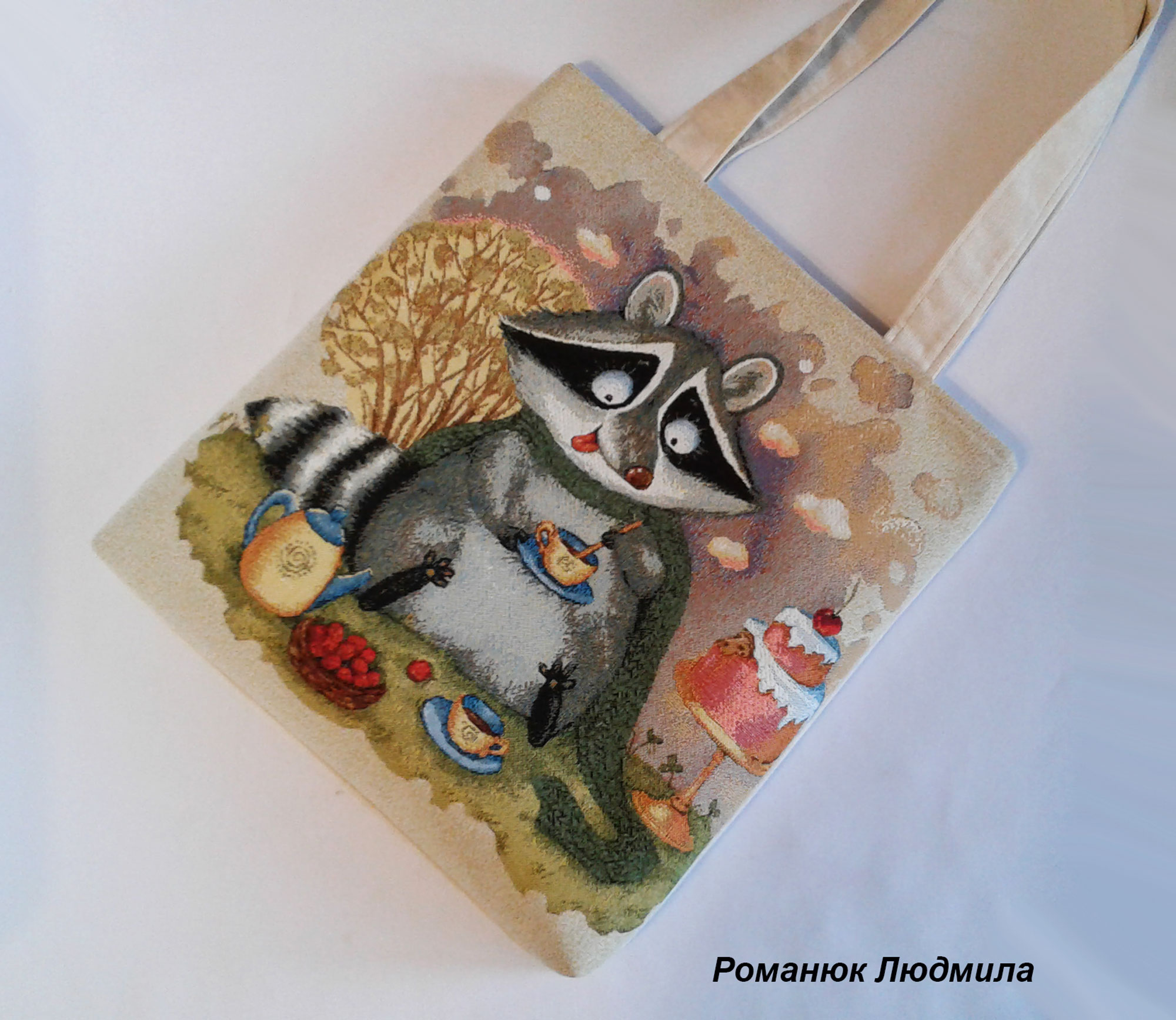 Выполнена из гобелена. Задняя сторона из микровельвета, внутри подклад с тремя кармашками, один на молнии. Сзади тоже есть карман. Сумка объемная и вместительная, закрывается на молнию. Носится на плече.