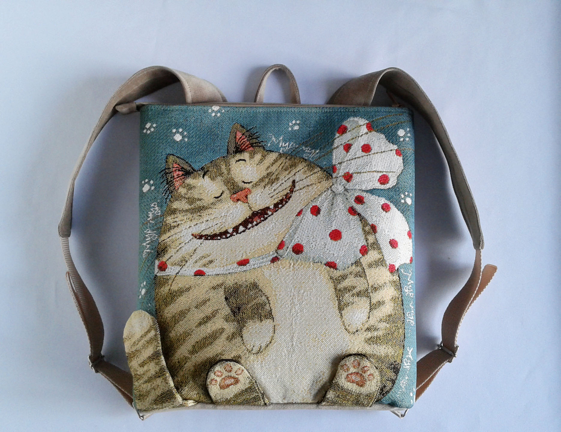 Обратная сторона, дно и лямки выполнены из микровельвета. Внутри яркий и не маркий подклад, есть два кармашка, один на молнии. Сзади есть удобный врезной карман на молнии. Ручки на рюкзаке можно регулировать по длине.
