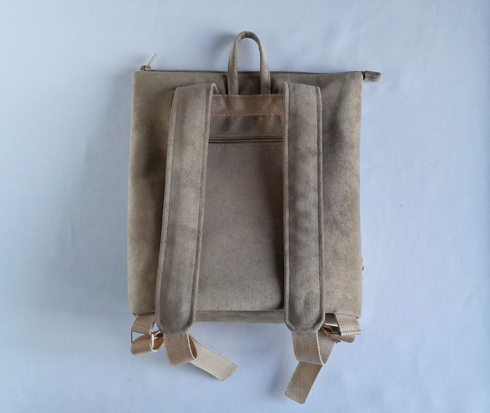 Обратная сторона, дно и лямки выполнены из микровельвета. Внутри яркий и не маркий подклад, есть два кармашка, один на молнии. Сзади есть удобный врезной карман на молнии. Ручки на рюкзаке можно регулировать по длине.