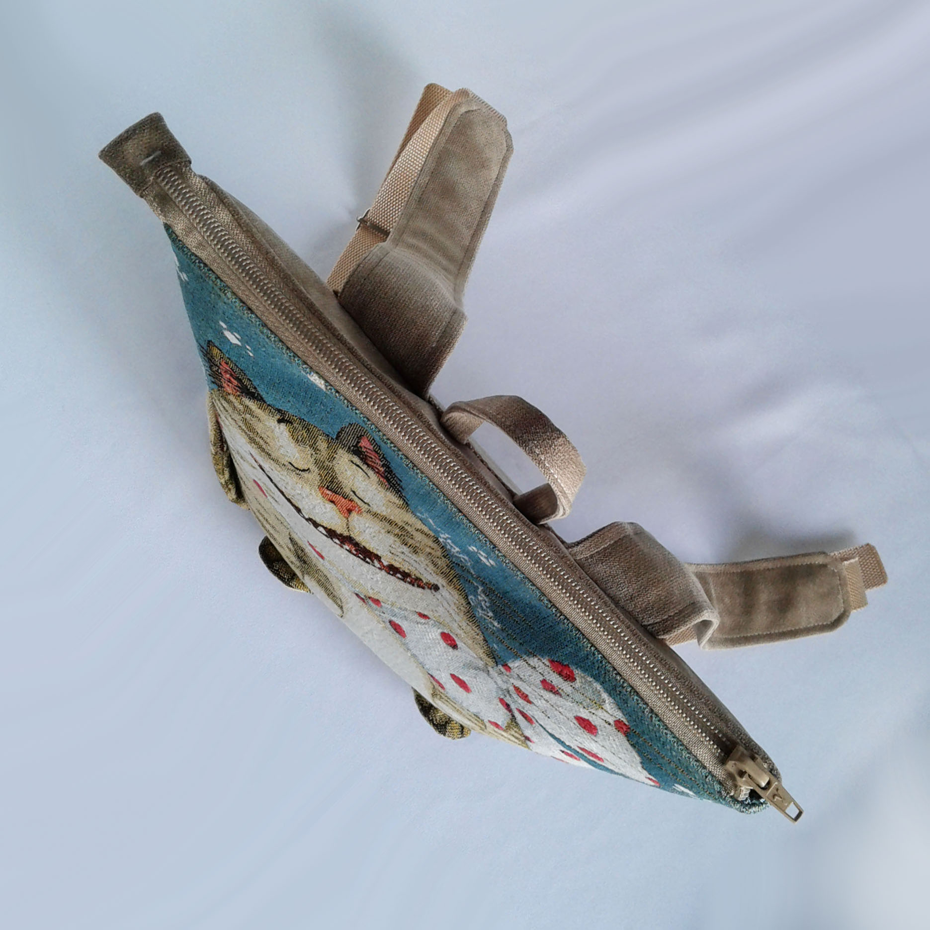 Обратная сторона, дно и лямки выполнены из микровельвета. Внутри яркий и не маркий подклад, есть два кармашка, один на молнии. Сзади есть удобный врезной карман на молнии. Ручки на рюкзаке можно регулировать по длине.