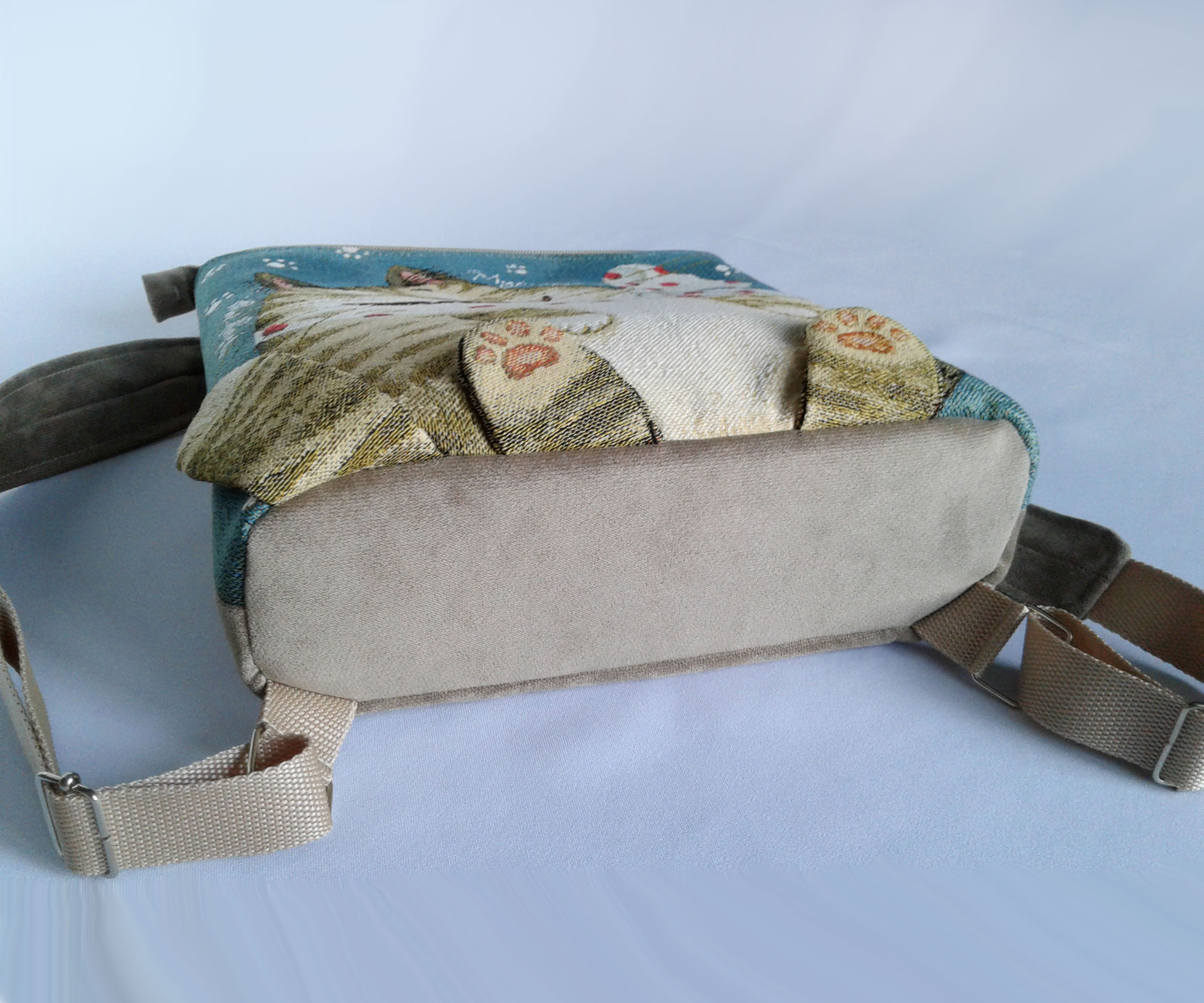 Обратная сторона, дно и лямки выполнены из микровельвета. Внутри яркий и не маркий подклад, есть два кармашка, один на молнии. Сзади есть удобный врезной карман на молнии. Ручки на рюкзаке можно регулировать по длине.
