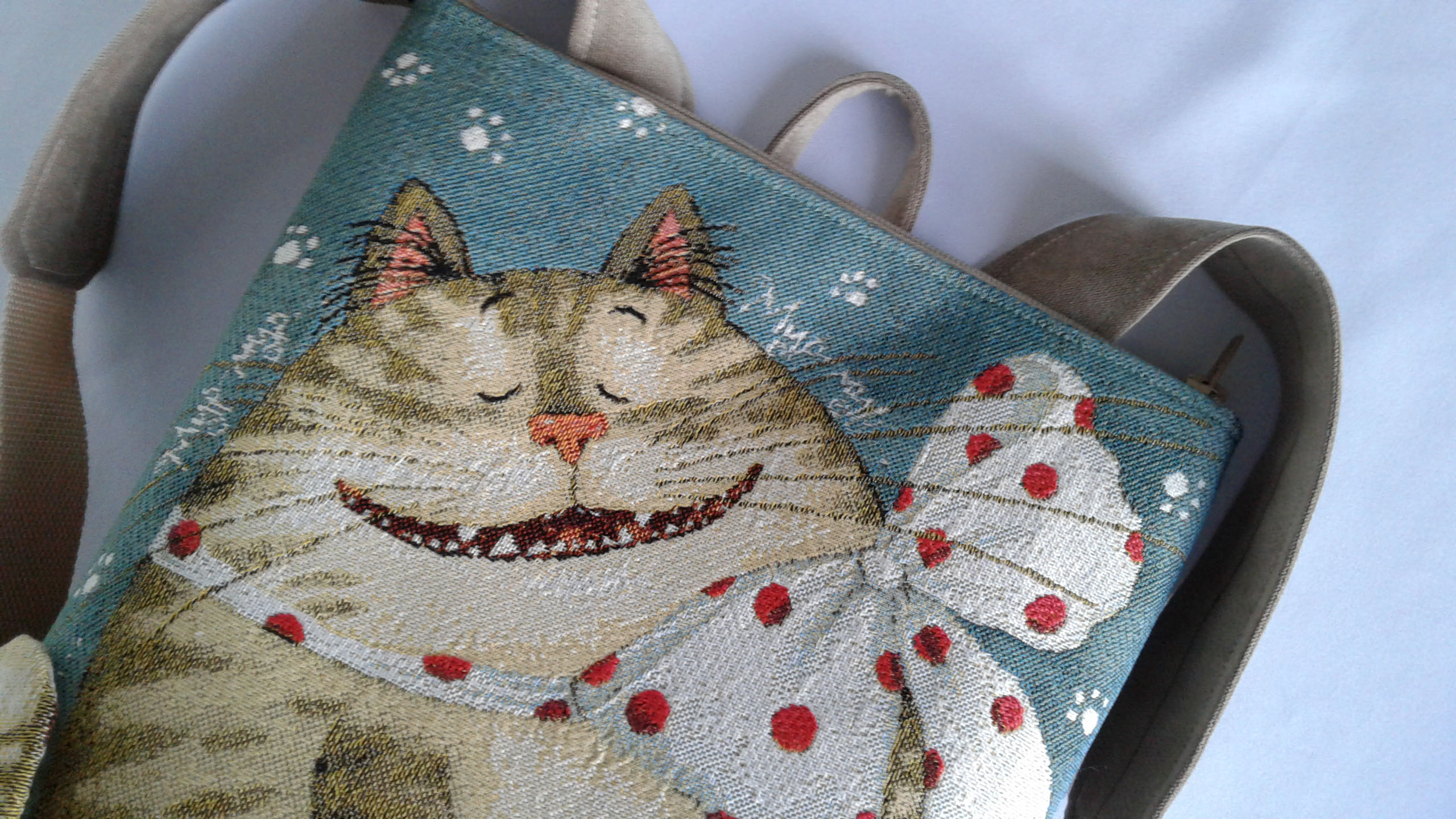 Обратная сторона, дно и лямки выполнены из микровельвета. Внутри яркий и не маркий подклад, есть два кармашка, один на молнии. Сзади есть удобный врезной карман на молнии. Ручки на рюкзаке можно регулировать по длине.